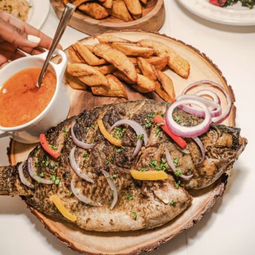 Whole Fish (Tilapia w bone) marinated with herbs, grilled and served with sautéed onions, pepper sauce and a side of plantain or rice